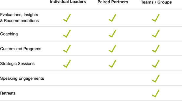 Sarita Felder and Associates knows that a ‘one size fits all’ approach to professional development does not work. Therefore, below is a table that presents an overview of solution options we offer to support your leaders. Within each area, a myriad of customizable options exists or will be created de novo for you.